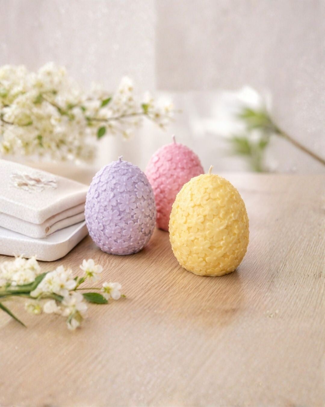 Deze verfijnde set van drie paasei kaarsen is met de hand gemaakt en afgewerkt met een prachtig bloemmotief. De zachte pastelkleuren zorgen voor een rustige, luxe uitstraling die perfect past bij jouw paasdecoratie.